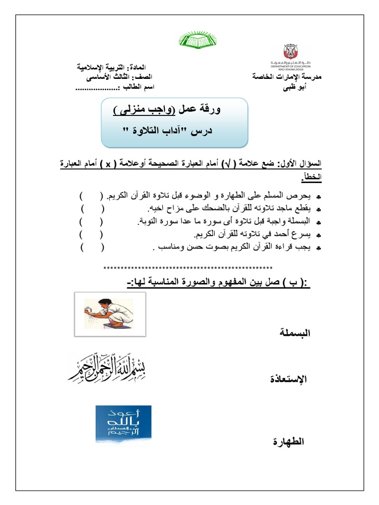 ورقة عمل اداب تلاوة القران بالصور. امتحان تربية إسلامية صف ثالث فصل أول 2019 2020. ورقة عمل درس سورة الناس تاريخ ووقت الإضافة. درس آداب تلاوة القرآن تربية إسلامية فصل أول صف ثالث تصفح أيضا. حل درس أداب النظافة في الاسلام تاريخ ووقت الإضافة.